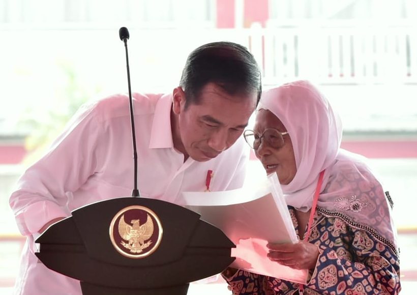 REHAT. Disela pembagian sertifikat tanah gratis kepada masyarakat, seperti biasa Presiden RI Joko Widodo (Jokowi) melemparkan pertanyaan kepada masyarakat. Masayu Ida (76) warga 22 Ilir Palembang salah satu warga yang berkesempatan maju dan menjawab pertanyaan dari Jokowi.
