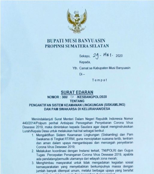 Surat edaran Bupati tertanggal 29 Mei 2020 nomor 300/130/90/2020 tentang pengaktifan sistem keamanan lingkungan sikampling dan PAM swakarsa di kelurahan dan desa menindaklanjuti surat menteri Dalam negeri republik Indonesia Nomor 440/2014/Polpum perihal antisipasi pencegahan penyebaran corona virus Desease 2019.
