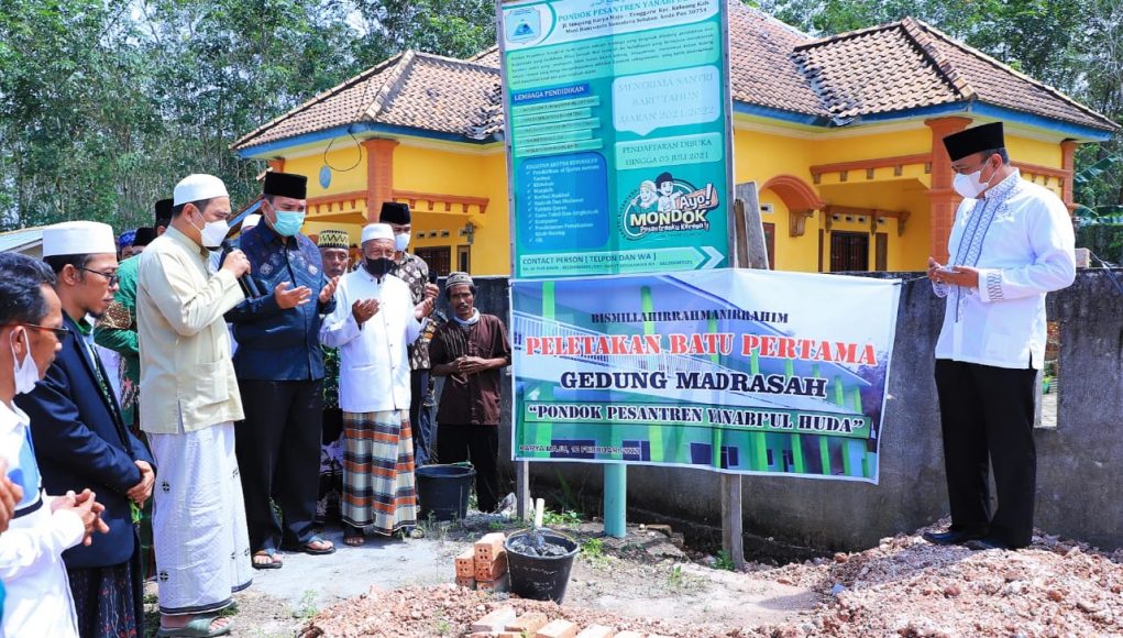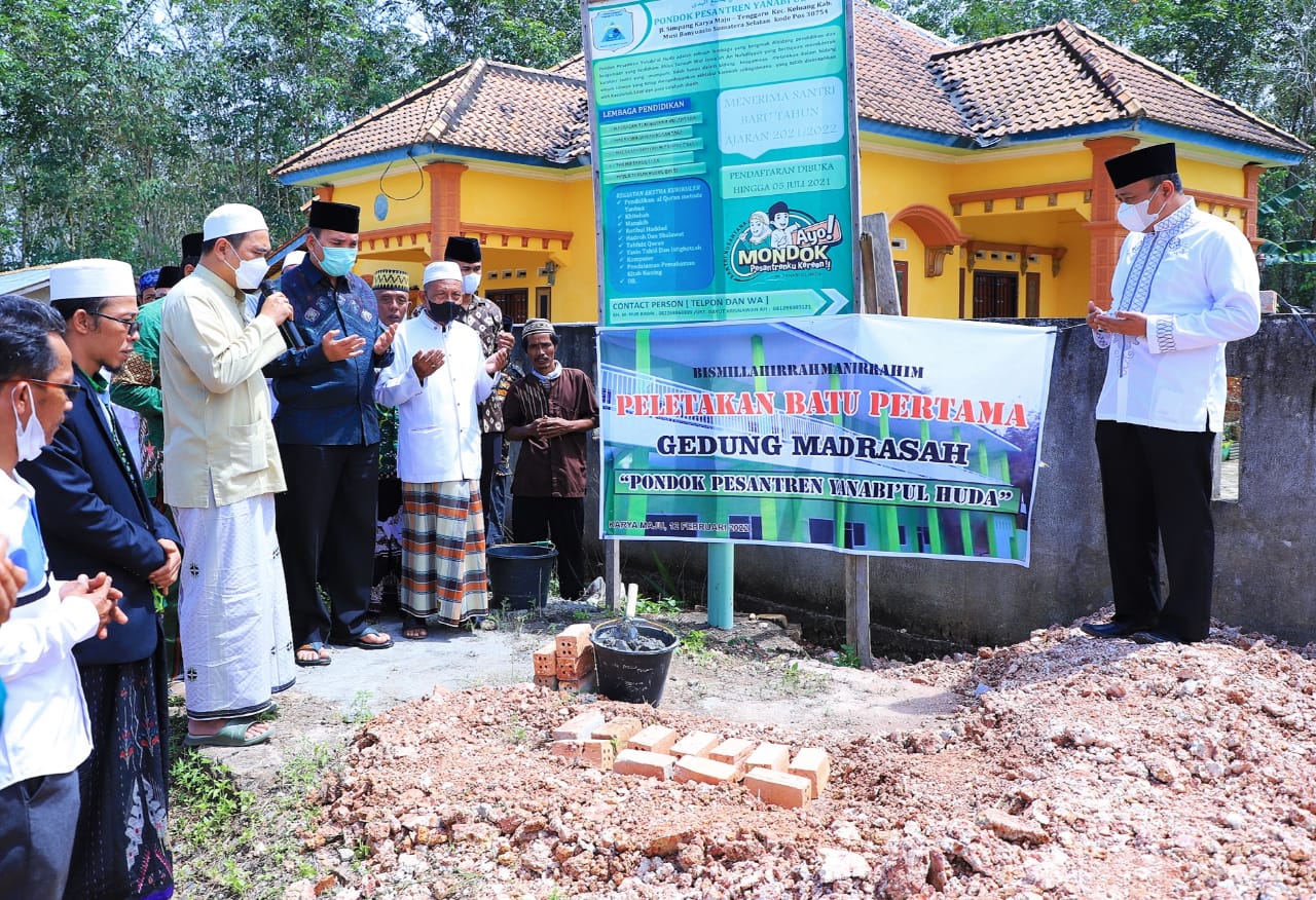 KELUANG, – Plt Bupati Musi Banyuasin Beni Hernedi SIP melakukan peletakan batu pertama pembangunan madrasah Pondok Pesantren Yanabi’ul Huda di Desa Karya Maju Kecamatan Keluang, Sabtu (12/2/2022).